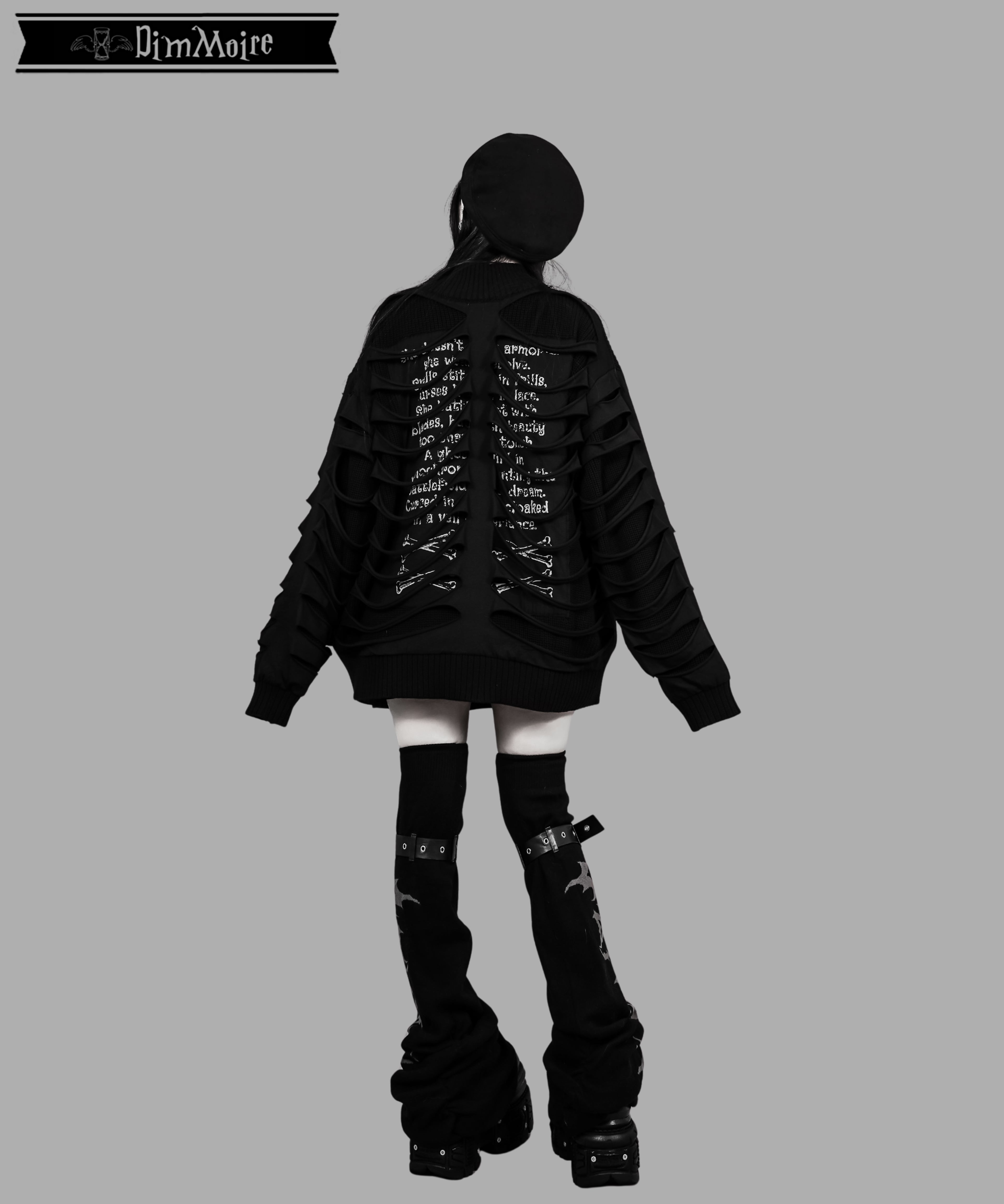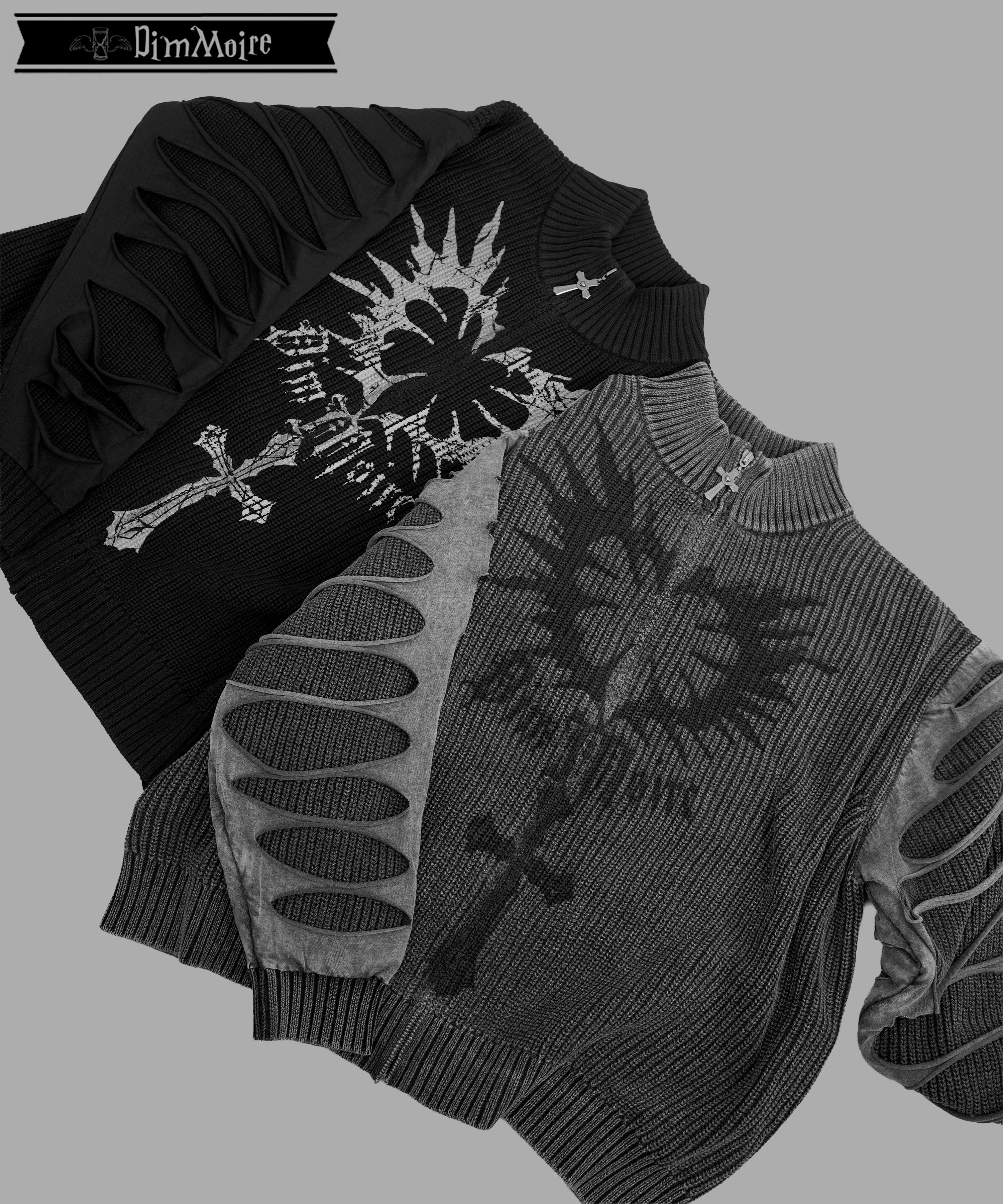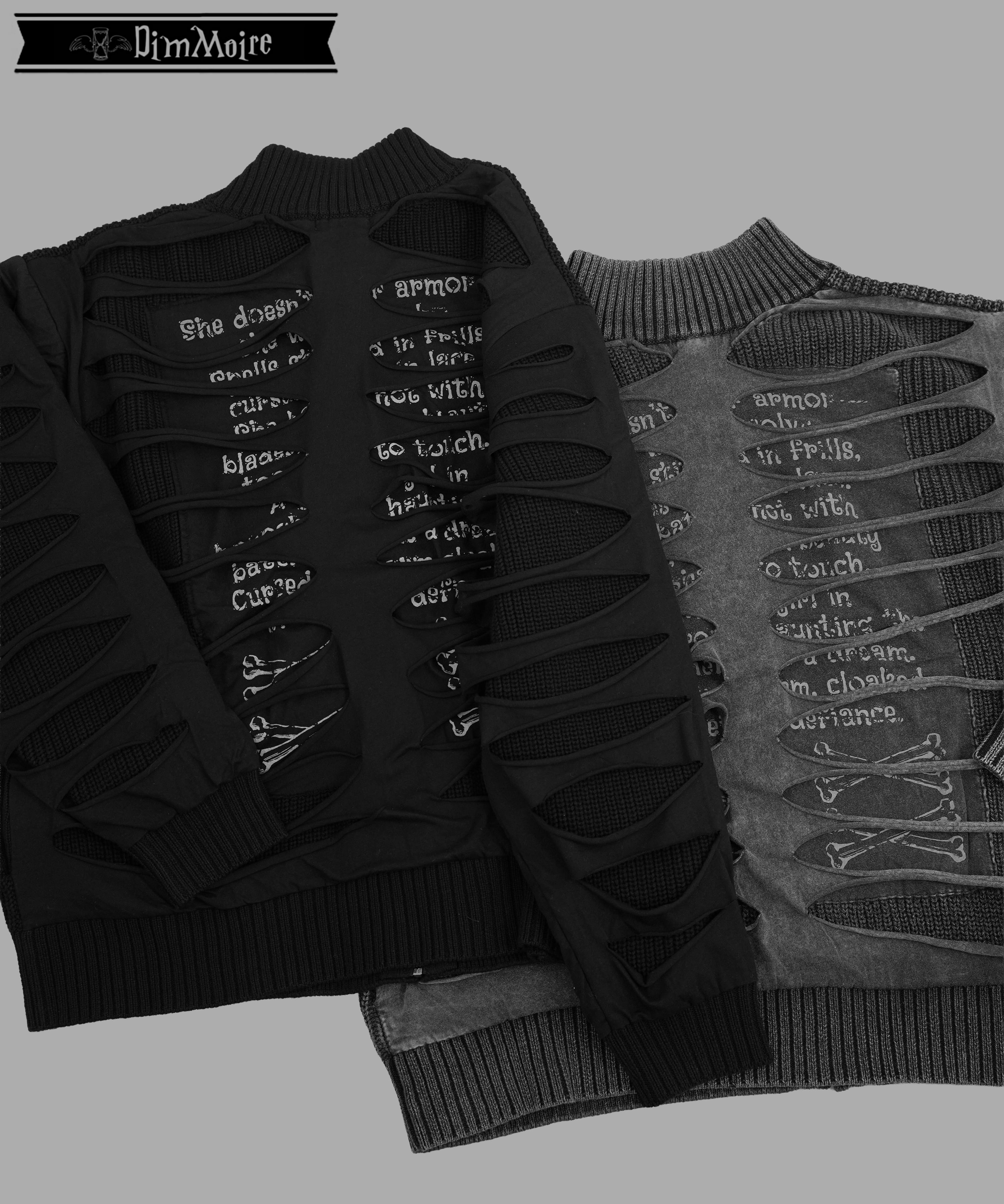 ニットの柔らかな着心地と、背骨を想起させる裂けデザインのコントラストがポイント.