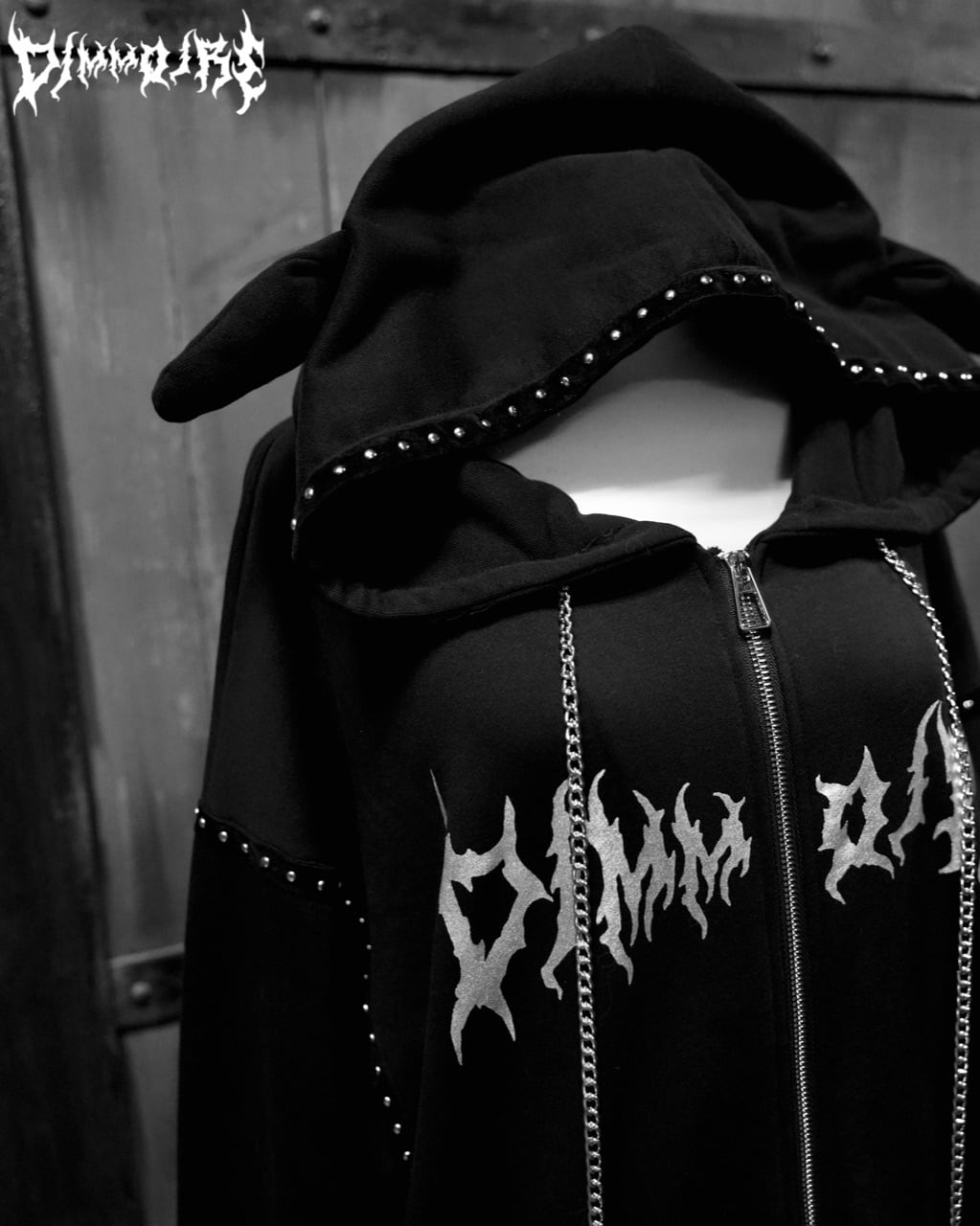 ダークエルフをモチーフにした耳付きフード、スタッズ&チェーン、シルバープリント